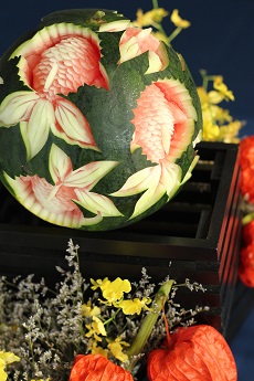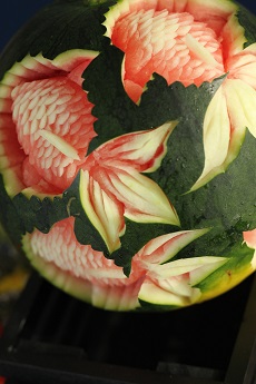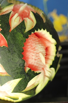 涼しさを演出したくて黒皮スイカへ金魚をカービング