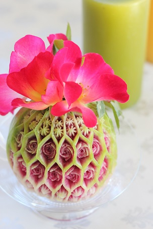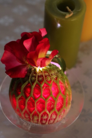 そんなコラボを夢見て 紅芯大根の器に ベランダに咲いていた一重咲きのバラ(カクテル)を差してみました。