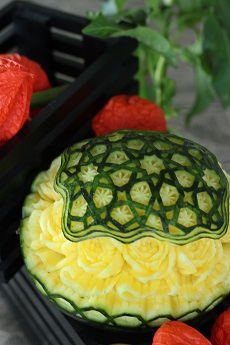 オレンジ色の可愛らしいほおずきに映える黄色いスイカ