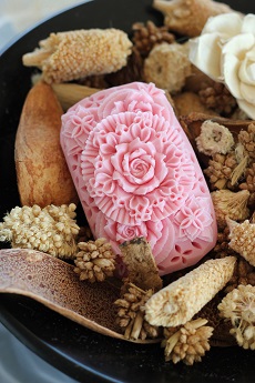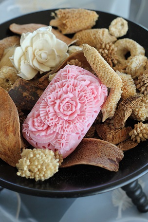 ナチュラルドライの実物やソーラーフラワーを入れた アジアンテイストの器へほんの数滴たらすローズフレグランス
