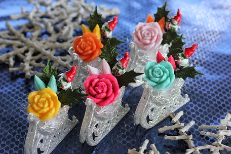 可愛らしいそりへカラフルなバラを載せたオブジェ